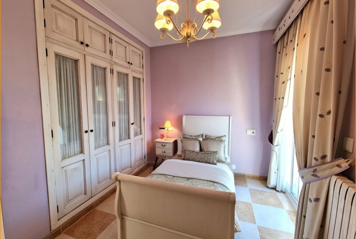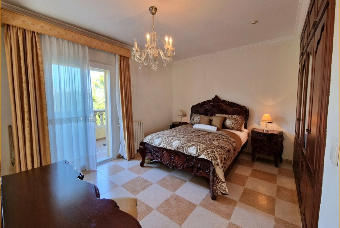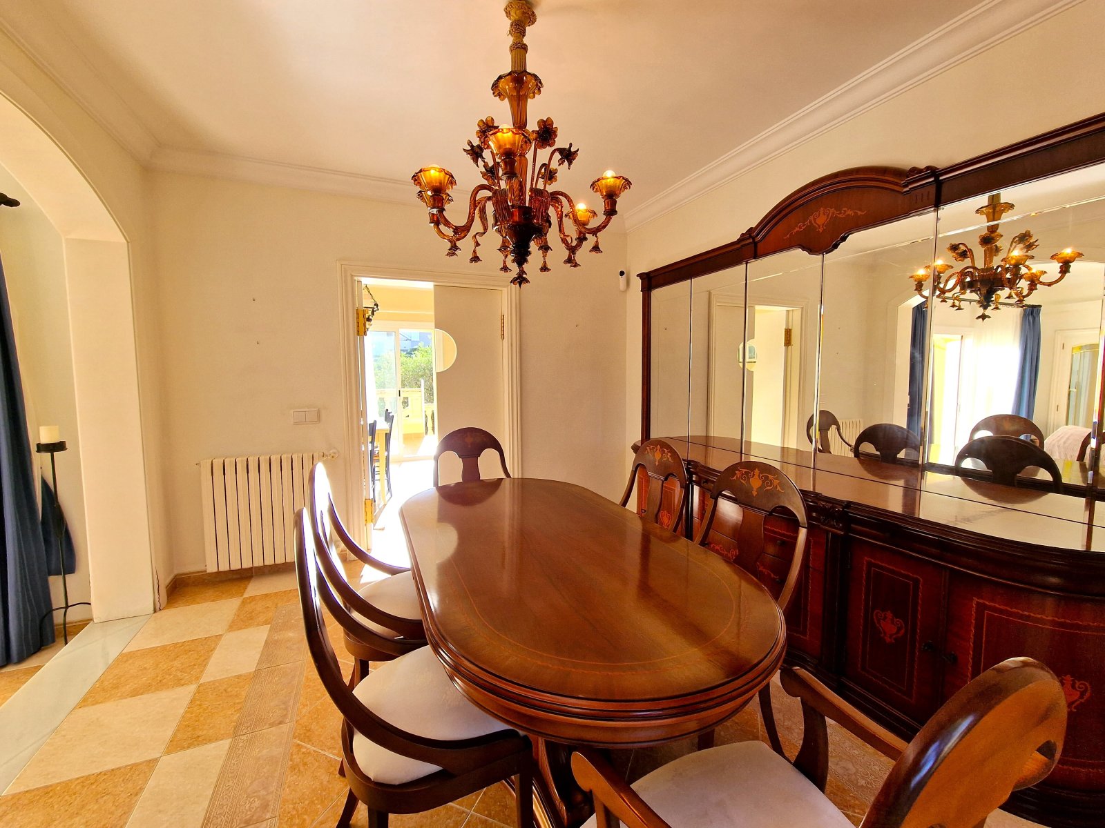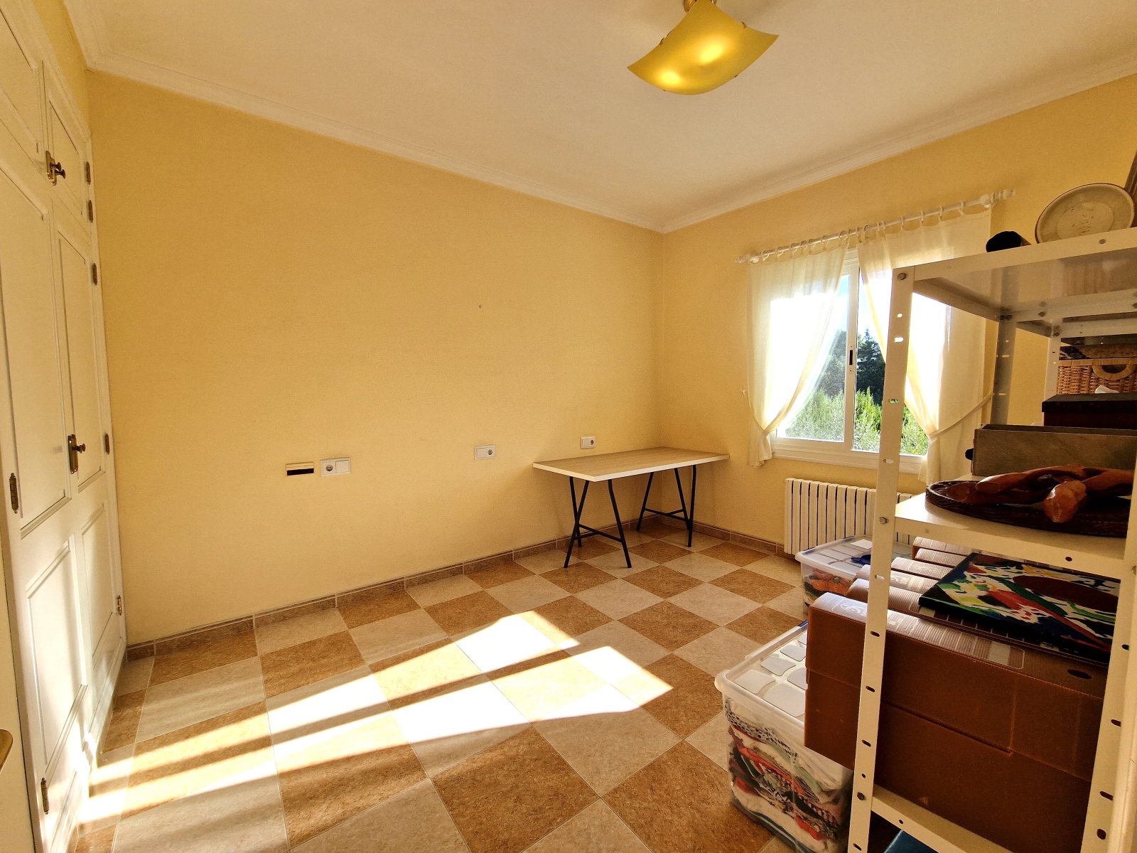 The small garden around the house is Mediterranean and very easy to maintain. You enter the reception area through the white, double-leaf front door and the white marble staircase with the elegant wrought iron railing immediately catches your eye. On the left side is the spacious garage, in the front area there is a spacious bathroom with pre-installation for a shower and a bedroom with exit to the terrace. On the right side there is the living area with a large fireplace, a separate dining room and the large kitchen with pantry and space for a breakfast table. These rooms also offer an exit to the sunny terrace with a decorative, working fountain. The utility room is also on this level.